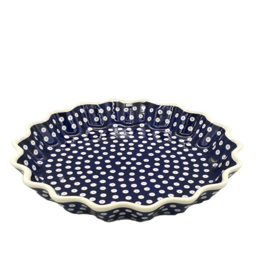 Tarta z ceramiki Bolesławiec w dekoracji 42 to wyjątkowe naczynie, które łączy funkcjonalność z estetyką. Wykonana z tradycyjnej bolesławieckiej ceramiki, ozdobiona ręcznie malowanym motywem białych groszków na kobaltowym tle, tarta doskonale nadaje się do pieczenia i serwowania ciast oraz innych potraw. Dzięki solidnemu wykonaniu i wysokiej jakości materiałom, tarta jest odporna na wysokie temperatury i może być używana w piekarniku. Piękny wzór sprawia, że tarta staje się również elegancką ozdobą stołu, idealną zarówno na co dzień, jak i na specjalne okazje.