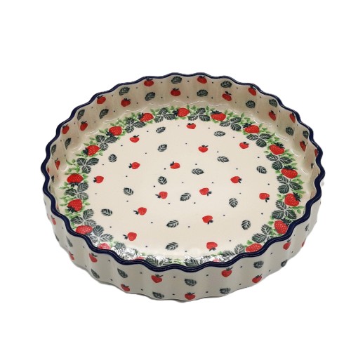Foremka do tarty o średnicy 24 cm w kształcie koła to piękne i praktyczne naczynie do pieczenia tart zarówno na słono, jak i na słodko. Jest ręcznie malowana wzorem z poziomkami i wykonana z wysokiej jakości gliny- kamionki. Foremka jest bezpieczna w piekarniku i kuchence mikrofalowej.
