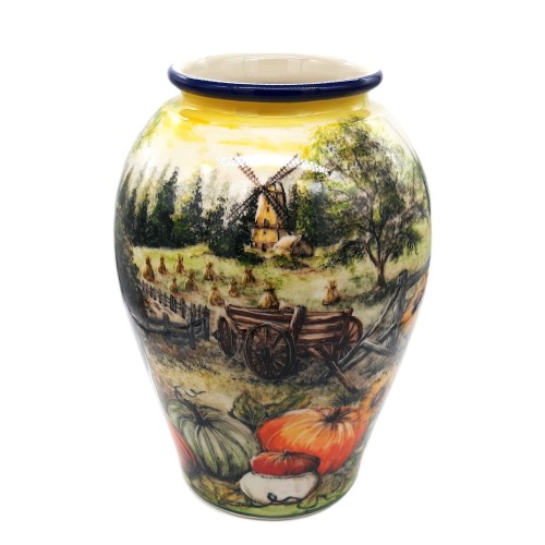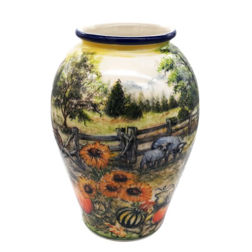 Wazon o wysokości 32,0 cm ukazuje przepiękny pejzaż gospodarstwa holenderskiego. Na wazonie można dostrzec malownicze sceny wiejskiego życia, takie jak pasące się krowy i owce, dumnie kroczący kogut, oraz obfite dynie na tle bujnej roślinności. Całość kompozycji uzupełniają drewniany wiatrak, wóz, urokliwe domki oraz słoneczniki, które dodają całości ciepła i barw.