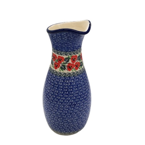 Jest to karafka na wodę lub wazon o wysokości 26,5 cm, wykonana z ceramiki bolesławieckiej, która charakteryzuje się charakterystycznym ręcznie malowanym wzorem. Widoczny wzór to motyw geometryczny oraz czerwone maki. Wyroby z Bolesławca są cenione za wysoką jakość wykonania i unikalne wzornictwo, często inspirowane tradycyjnymi technikami ręcznego zdobienia.