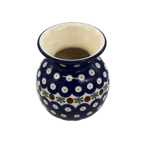 Wazon ceramiczny Bolesławiec o wysokości 10,5 cm, ręcznie wykonany i zdobiony metodą stempelkową przez Spółdzielnię Rękodzieła Artystycznego Bolesławiec. Klasyczna biało-niebieska kolorystyka z motywem pawich oczek. Produkt polski, wysokiej jakości, przystosowany do mycia w zmywarce. Idealny jako dekoracja lub drobny prezent.
