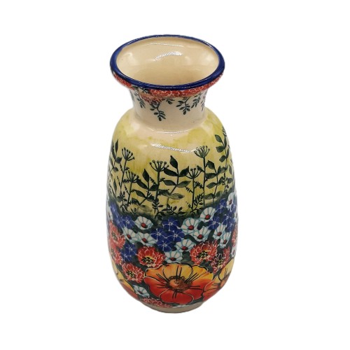 Wazon z ceramiki bolesławieckiej o wysokości 22 cm to wyjątkowy element dekoracyjny, który łączy tradycję rękodzieła z funkcjonalnością. Jego powierzchnię zdobią starannie wykonane, ręcznie malowane motywy kwiatowe, charakterystyczne dla ceramiki bolesławieckiej. Najczęściej spotykane odcienie to głęboki niebieski, czerwony zielony, które tworzą harmonijną i elegancką kompozycję. Wazon ma klasyczną, smukłą formę, która dobrze eksponuje kwiaty i sprawia, że jest stabilny. Szkliwiona powierzchnia dodaje mu trwałości i pięknego połysku, dzięki czemu stanowi efektowną ozdobę wnętrza, zarówno jako samodzielny element dekoracyjny, jak i wypełniony świeżymi kwiatami.