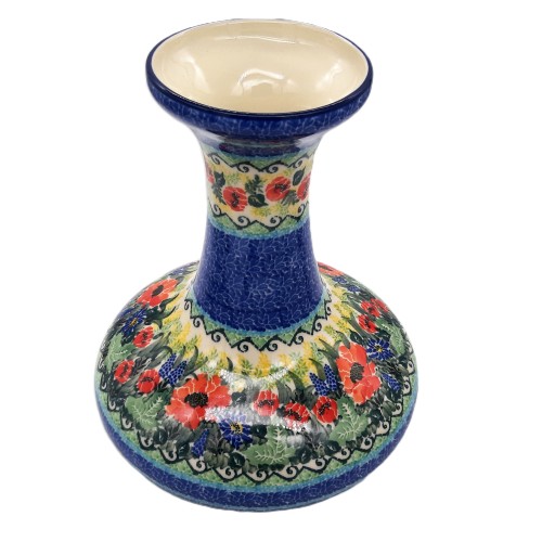 Wazon zachwyca intensywną kolorystyką – połączeniem czerwonych i niebieskich kwiatów z zielonymi motywami roślinnymi. Każdy egzemplarz jest dekorowany ręcznie metodą stempelkową, co nadaje mu unikatowy charakter.
