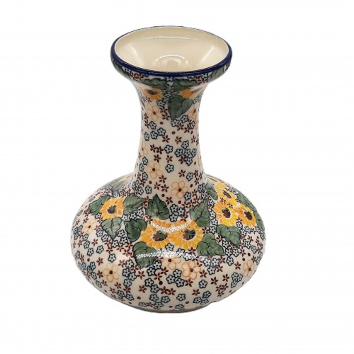 Wazon zachwyca intensywną kolorystyką – połączeniem żółtych słoneczników, niebieskich oraz brązowych drobnych kwiatuszków. Każdy egzemplarz jest dekorowany ręcznie, co nadaje mu unikatowy charakter.