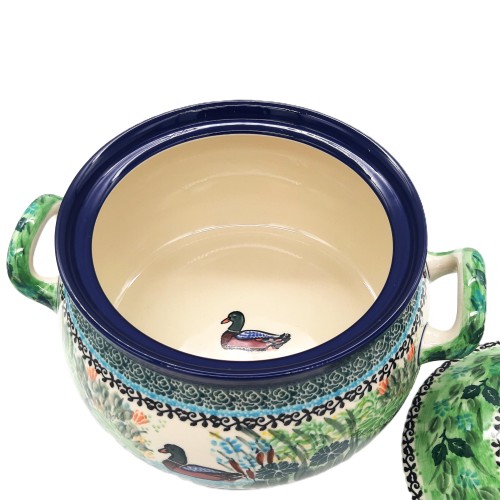 Waza z ceramiki Bolesławiec o pojemności 3,6 litra to wyjątkowy element dekoracyjny i użytkowy, charakteryzujący się unikatowym wzornictwem roślinnym z elementem kaczki. Ręczne zdobienia nadaje jej unikalny charakter, typowy dla ceramiki bolesławieckiej.