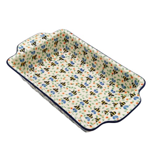 Na zdjęciu widoczna jest zapiekanka z uszami o wymiarach 33,2 cm x 19,3 cm i wysokości 6 cm, wykonana z ceramiki bolesławieckiej. Naczynie jest ozdobione ręcznie malowanym motywem pszczółek, co nadaje mu radosny, rustykalny charakter.