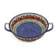 Na zdjęciu przedstawiono zapiekankę z uszkami o średnicy 20,5 cm, h : 5,0 cm wykonaną z ceramiki bolesławieckiej. Naczynie ozdobione jest pięknym, ręcznie malowanym motywem w maki oraz geometrycznym. Ucha po bokach ułatwiają przenoszenie i serwowanie potraw.