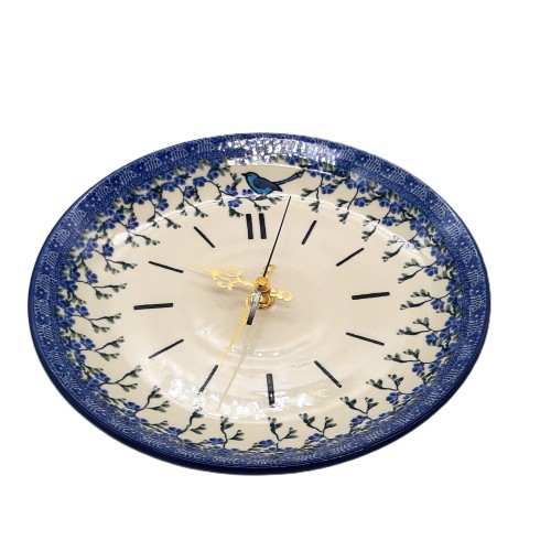 Zegar ścienny z ceramiki bolesławieckiej, to elegancki i funkcjonalny element dekoracyjny. Wykonany ręcznie, zgodnie z tradycją bolesławiecką, zegar posiada  wzór  zdobiony motywem roślinnym z elementem ptaszka na jasnym  tle. Zasilany na baterię, jest praktyczny w użytkowaniu, a jednocześnie stanowi piękną ozdobę ściany, idealną do kuchni, jadalni czy salonu. Ceramika Bolesławiec znana jest z trwałości i wysokiej jakości, co sprawia, że zegar ten posłuży przez wiele lat, ciesząc oko unikalnym wzornictwem.